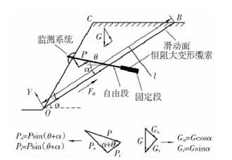 下滑力監(jiān)測(cè)方法為通過(guò)恒阻大變形纜索穿過(guò)滑動(dòng)面,對(duì)邊坡巖體施加一個(gè)預(yù)應(yīng)力 p。通過(guò)可以直接測(cè)出的擾動(dòng)力 p,可以推導(dǎo)擾動(dòng)力和滑動(dòng)力之間的函數(shù)關(guān)系,*終得到滑動(dòng)力的變化量 addin ne.ref.{ce1bd0ee-846a-4eb8-8fcf-f644930163e4}[3]。邊坡滑動(dòng)力監(jiān)測(cè)力學(xué)模型見圖1。由力的平衡原理,推導(dǎo)邊坡滑動(dòng)力為